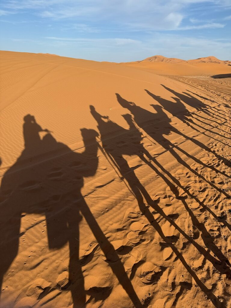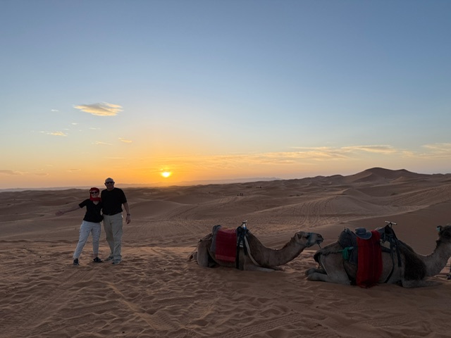 Our Sahara adventure began with the iconic desert transport – a camel! We embarked on a one-hour camel trek, slowly ascending the magnificent Erg Chebbi dunes. With every gentle sway of our camel, the world around us transformed. The sand, a vibrant orange under the setting sun, stretched endlessly in every direction, its ripples forming an intricate tapestry. As we reached the summit, a breathtaking panorama unfolded. The sun dipped below the horizon, painting the sky in fiery hues of orange, pink, and purple, casting long, dramatic shadows across the undulating dunes. It was a spectacle of nature’s artistry, a moment of profound peace and unparalleled beauty.